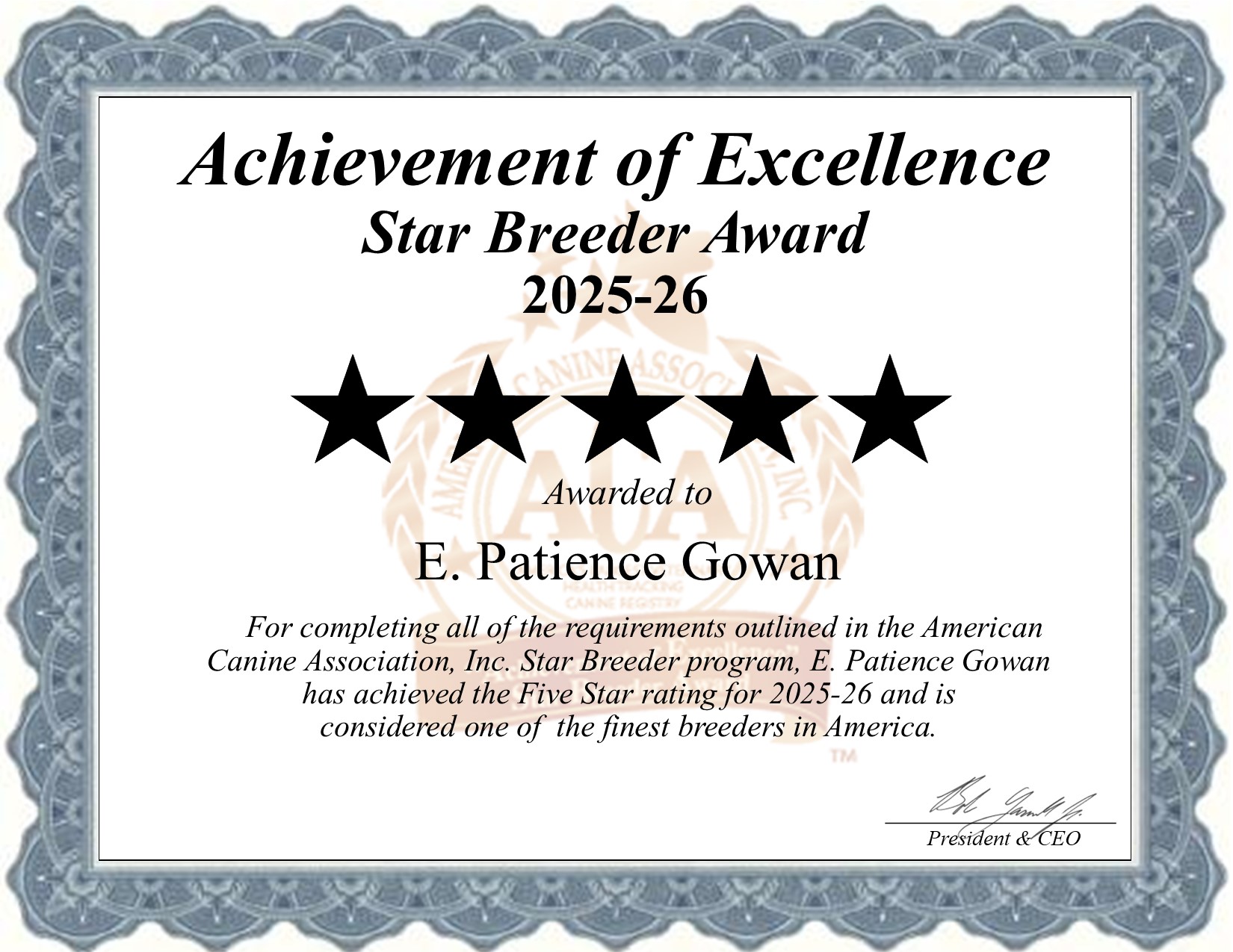 - E. Patience Gowan has attended over 6 hours of ongoing breeder educational seminars for 2024-25.
